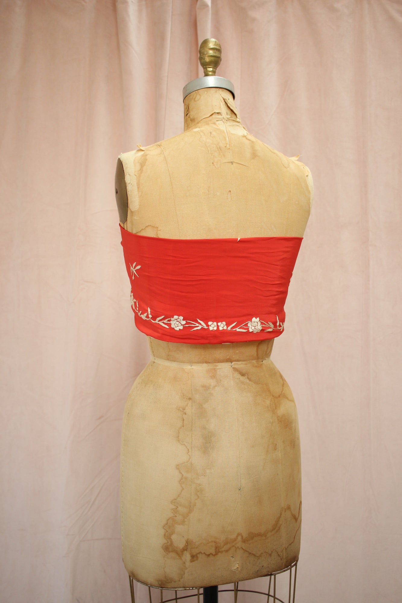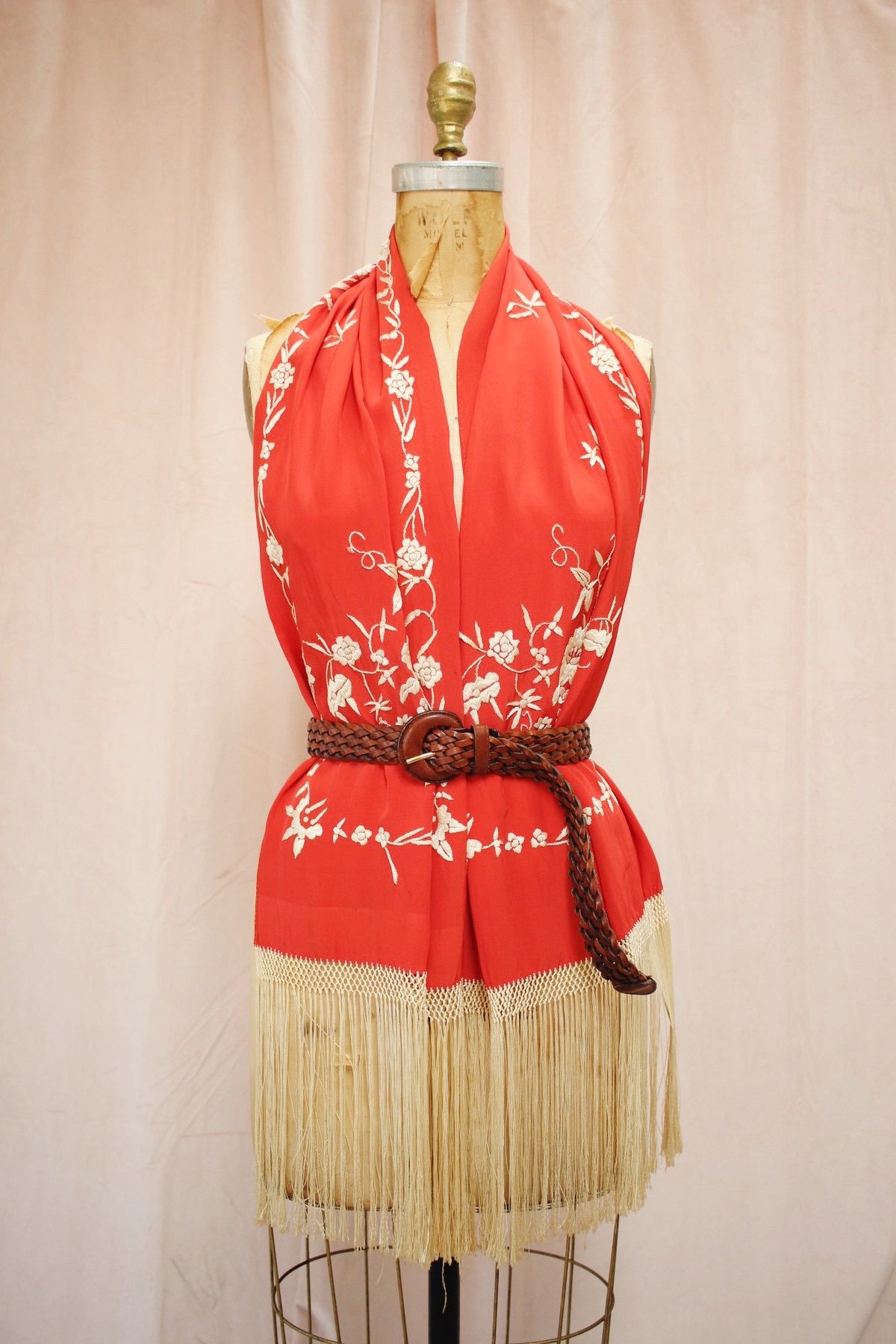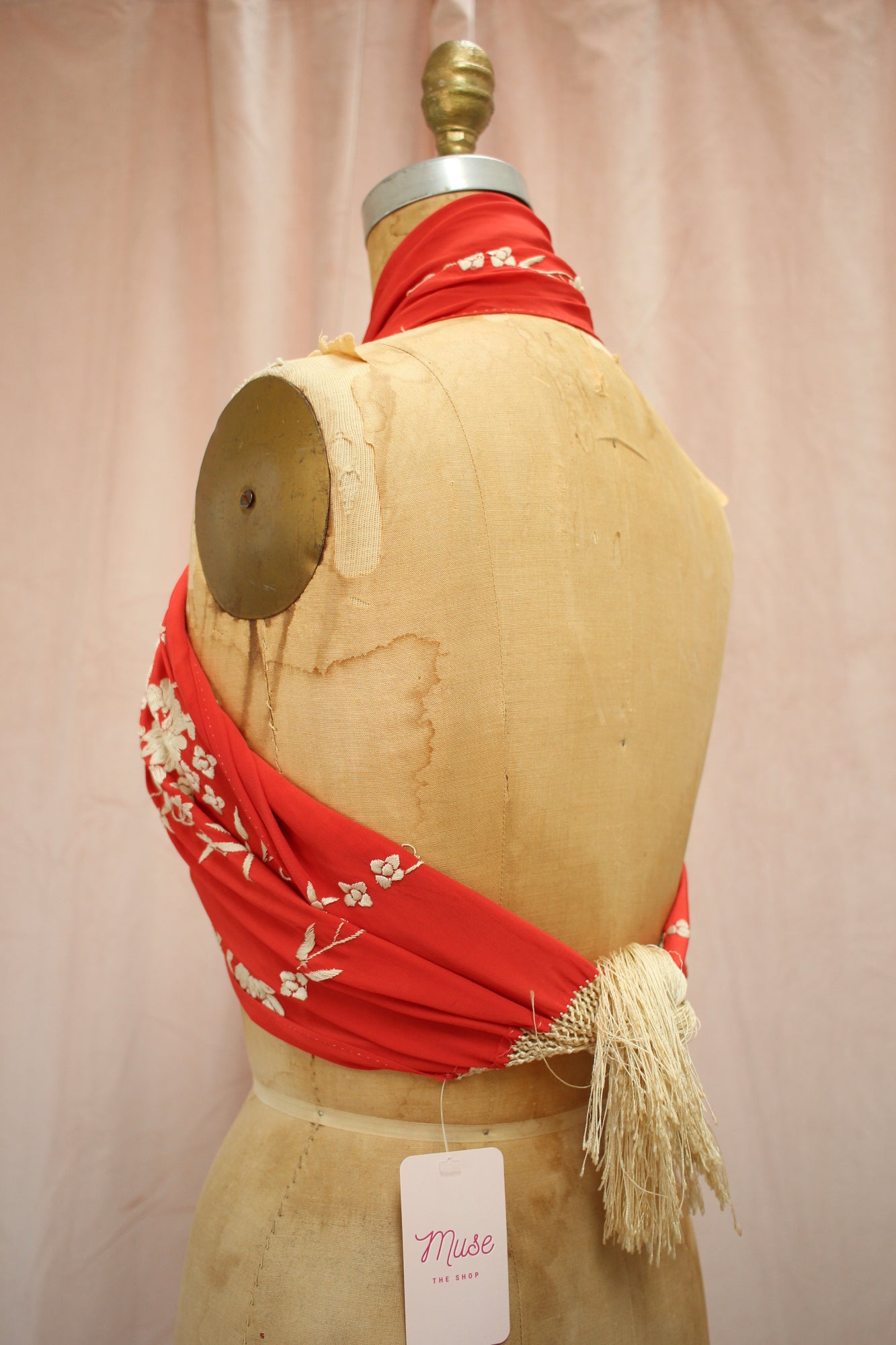 A special yet highly versatile vintage silk shawl. Dating to the 1920s, this gorgeous antique red hand embroidered shawl can be worn lots of different ways. Tie it into a bandeau, wear it wrapped or simply wear it loose over a kimono. However you wear it, indulge in the fantasy of the flapper era and you will love wearing this shawl!