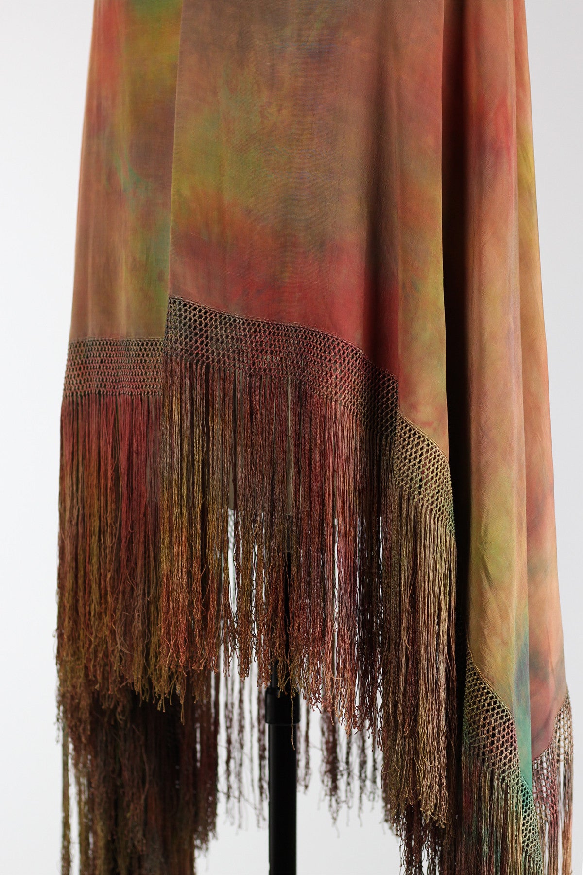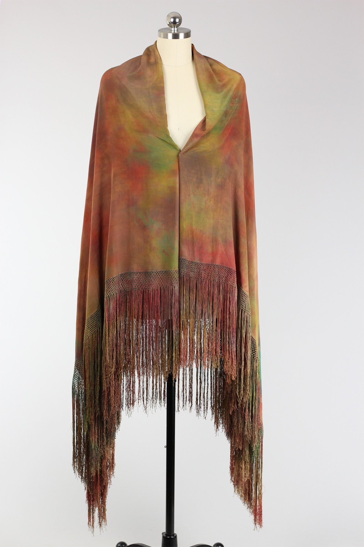 This is a beautiful Chinese silk shawl dating from the 1920s. It is made of silk charmeuse and was tie-dyed by a local Berkeley artist. Featuring wonderfully blended colors of reds, oranges, greens, and burnt orange - this shawl has a mysterious yet grounding effect when worn. The silk is supple and silky to the touch; combined with the colors it was dyed it creates a beautiful sheen. Long ombre fringe and hand knotting add weight and depth to this already spectacular piece!