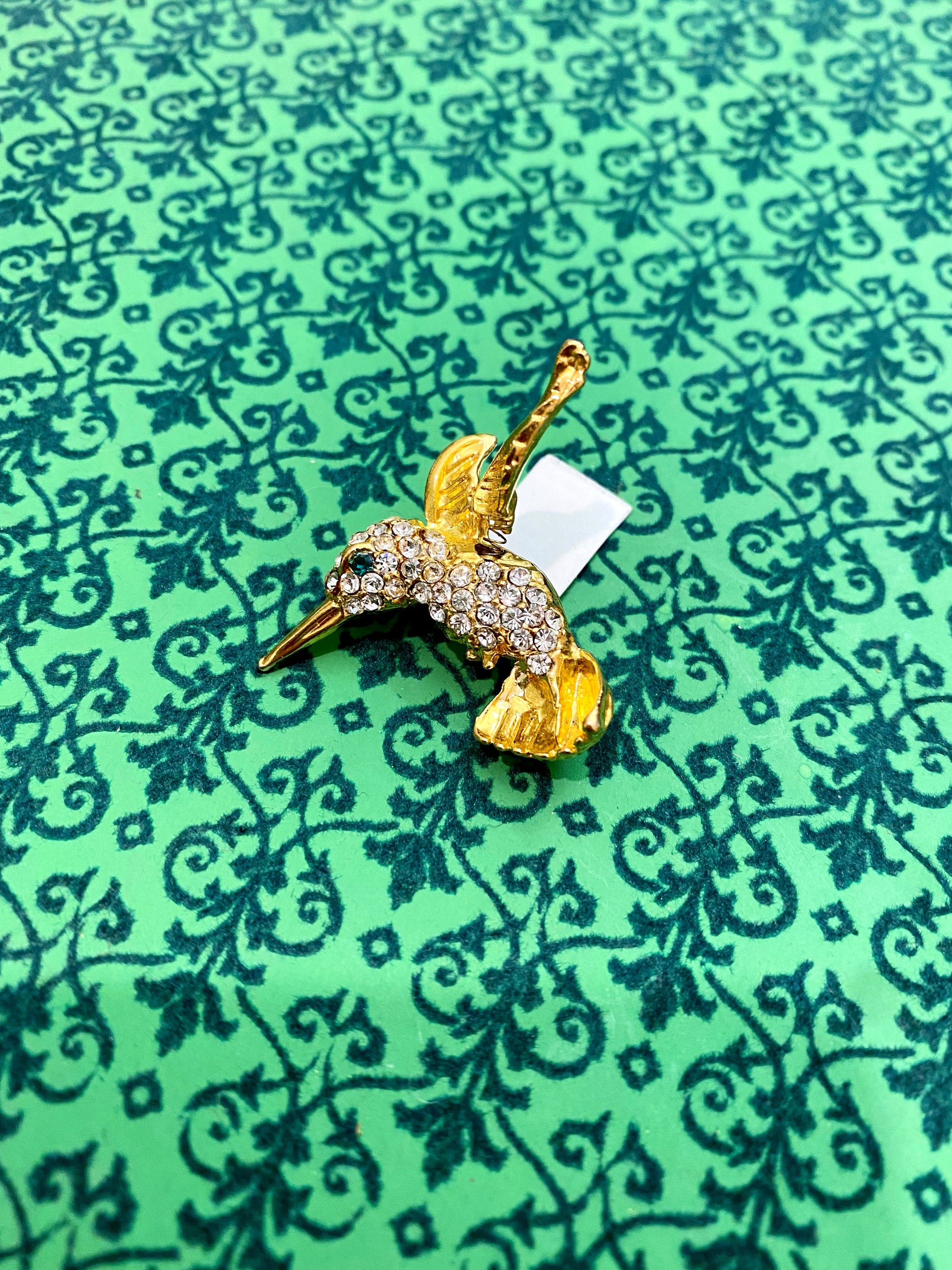 For vintage hummingbird lovers. Gold plated vintage 1950s-60s hummingbird brooch with jeweled eyes and rhinestone body. Right wing is attached with a spring, so it moves / articulates.