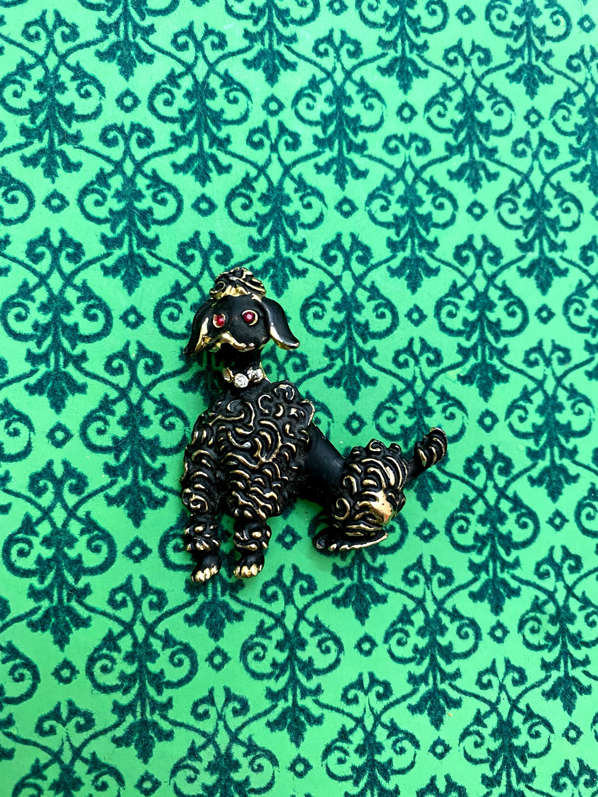 For vintage poodle lovers. Gold plated vintage 1950s poodle brooch made of black matte enamel, Ruby red crystal eyes, and rhinestone collar.