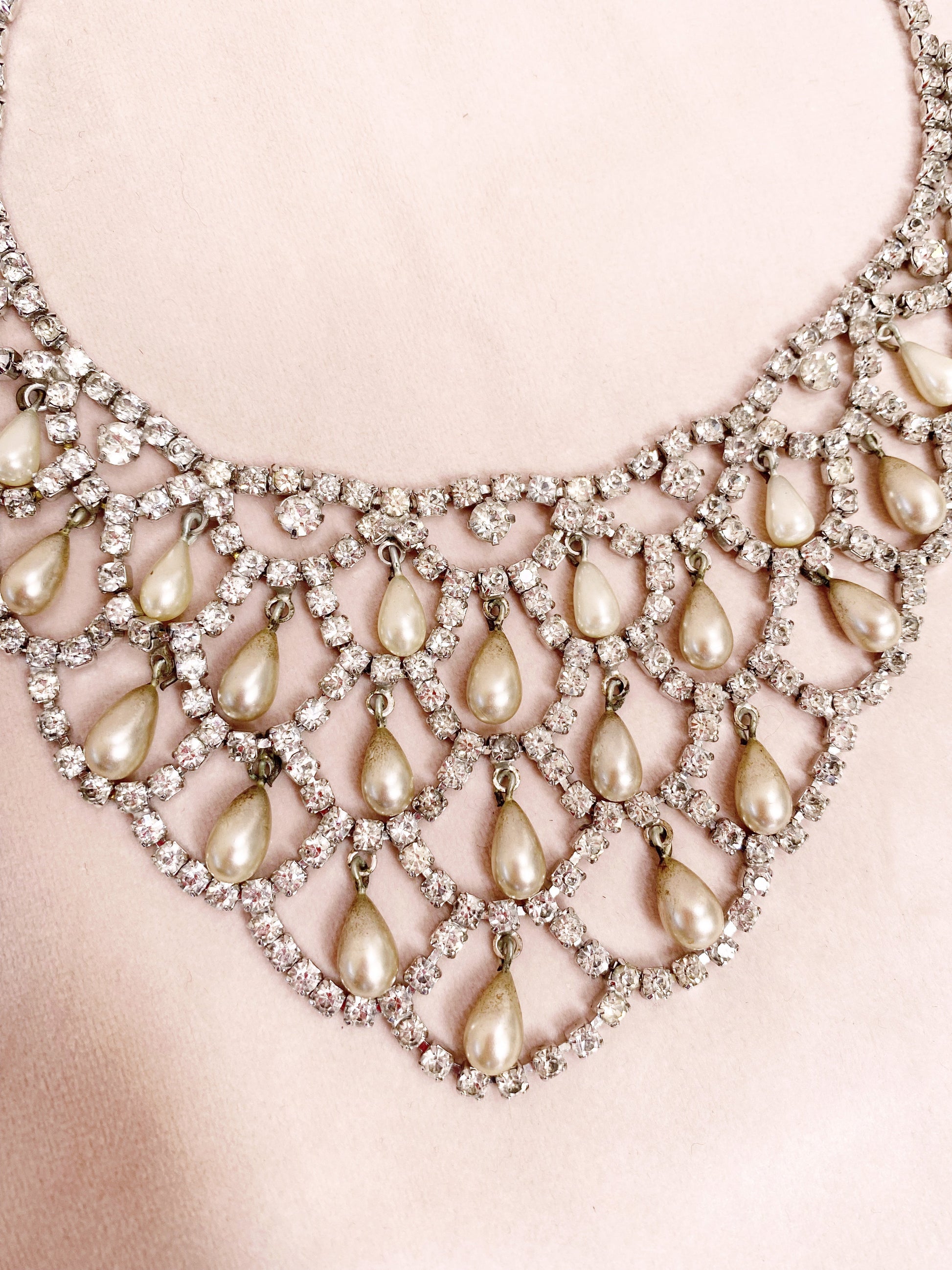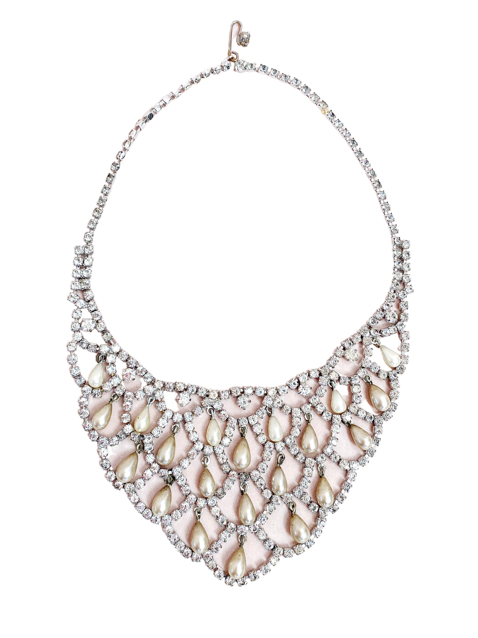 Gorgeous vintage white diamond rhinestone 1940s-50s waterfall necklace that truly sparkles. Very Audrey Hepburn in Breakfast At Tiffany’s. Silver tone chain and settings, faux Pearl drops.