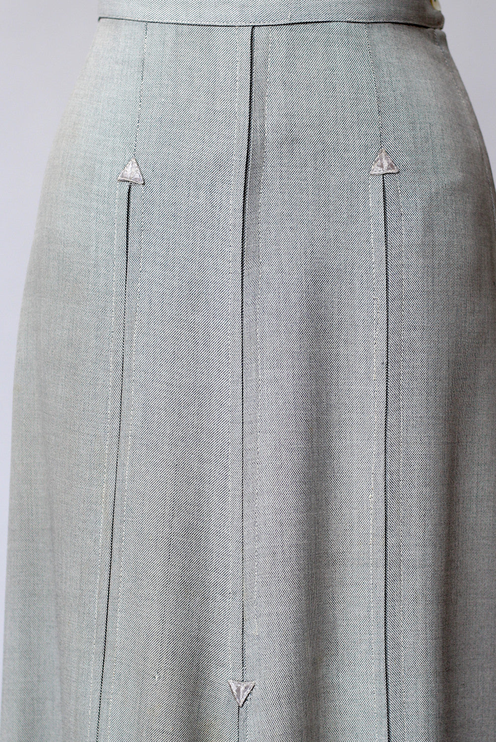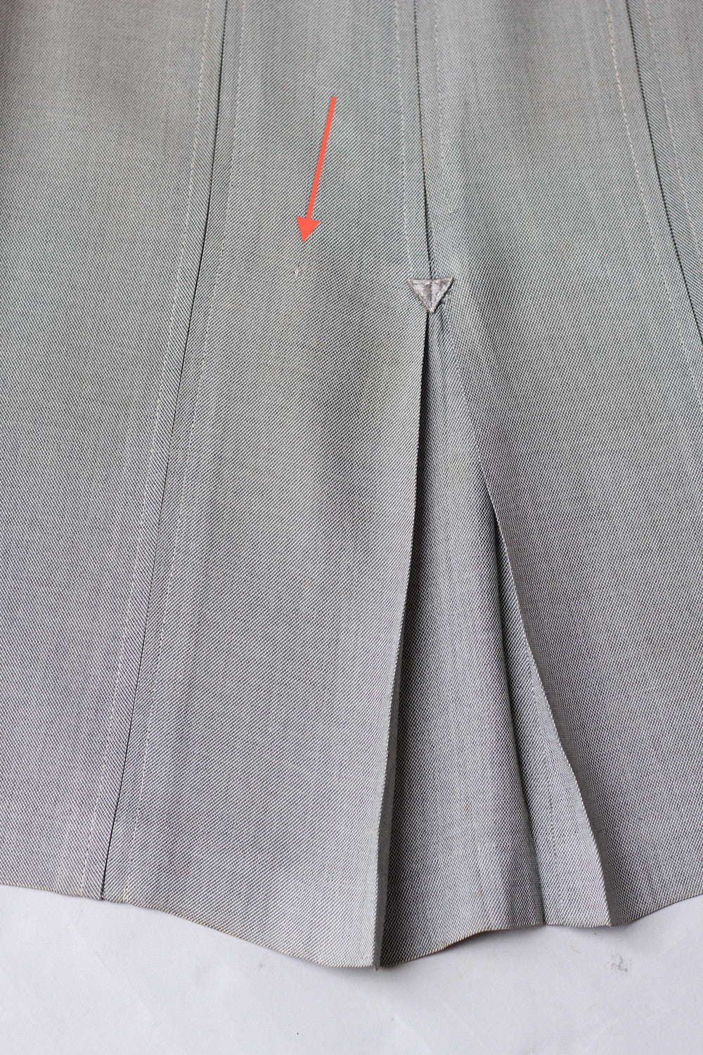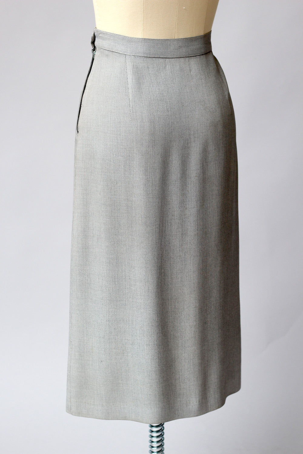 Condition: Good vintage condition with some light wear. This skirt has been dry cleaned so it is ready to wear. There is some light yellowing to the fabric on the left side of the skirt and at the very top edge of the waistband (hard to see due to the grey fabric but look at the closeup). There is one pin-sized hole in the fabric on the front of the skirt (again not too noticeable because it's so small).