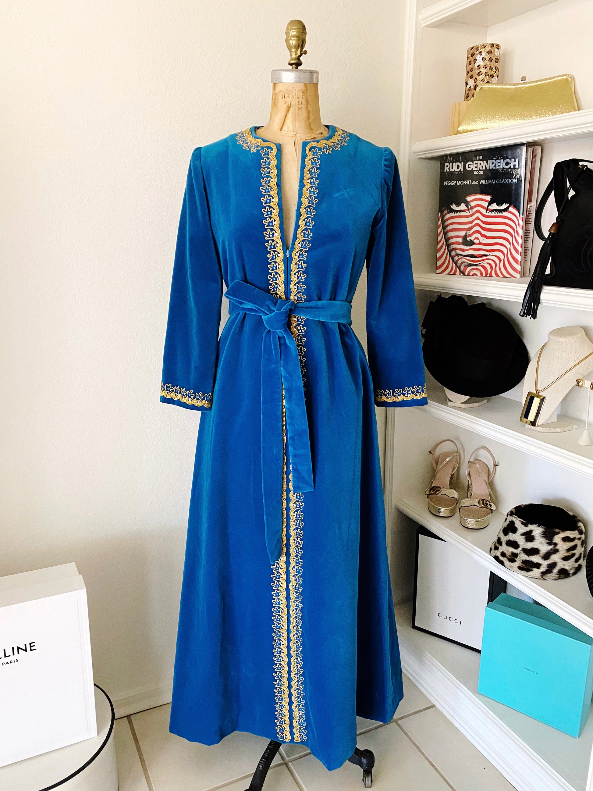 Sumptuous and gorgeous hand embroidered teal velvet caftan dress from Elizabeth Arden. The cotton velveteen fabrics has a beautiful and soft touch, and the color it picks up in the light is truly extraordinary.